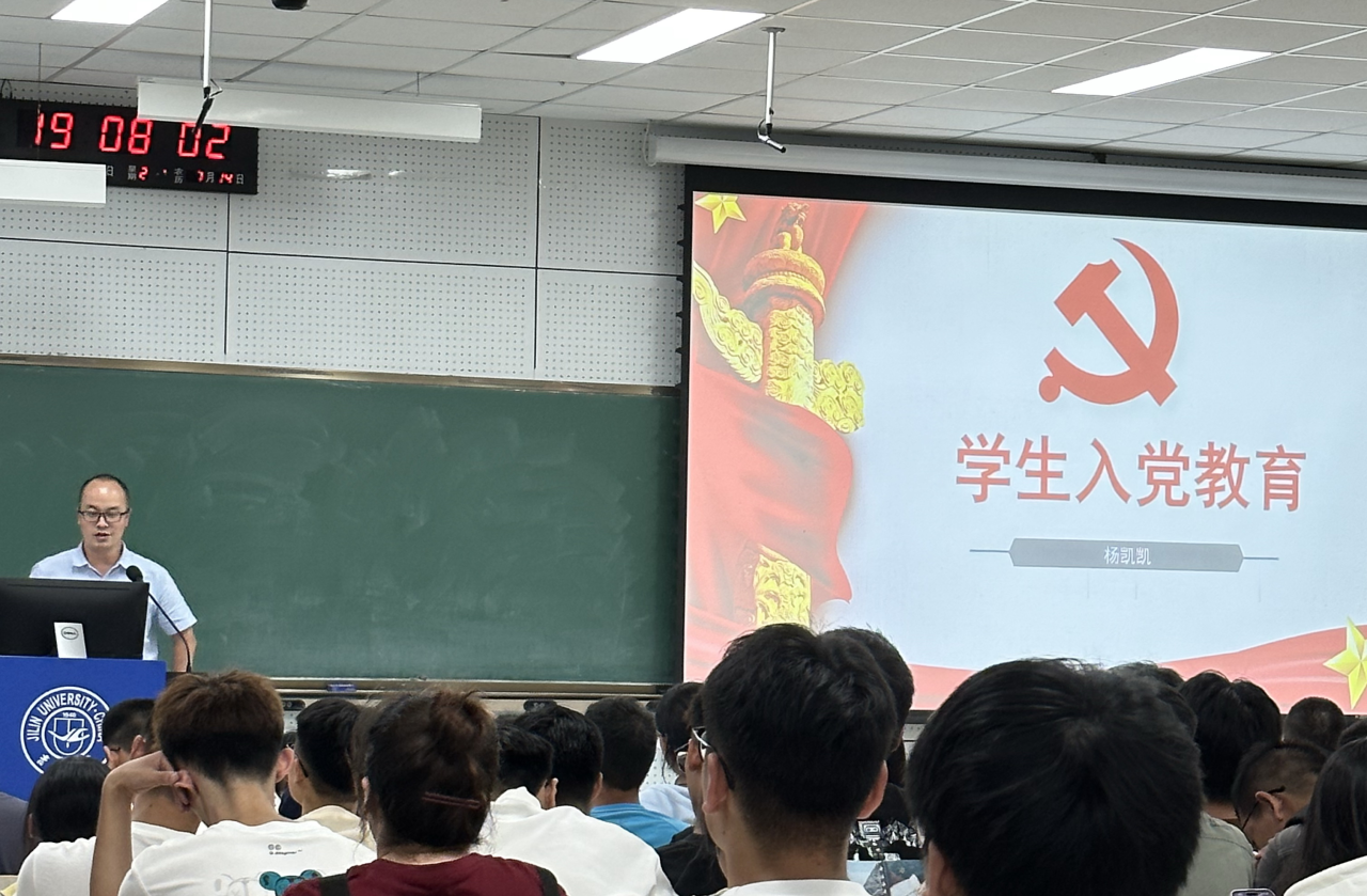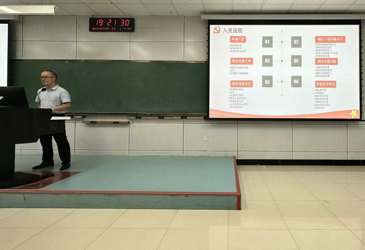 在李四光楼104教室为全体2023级本科生开展入党教育专题讲座。此次讲座由学院学生工作办公室主任、党务秘书(兼)、2023级辅导员杨凯凯主讲。
