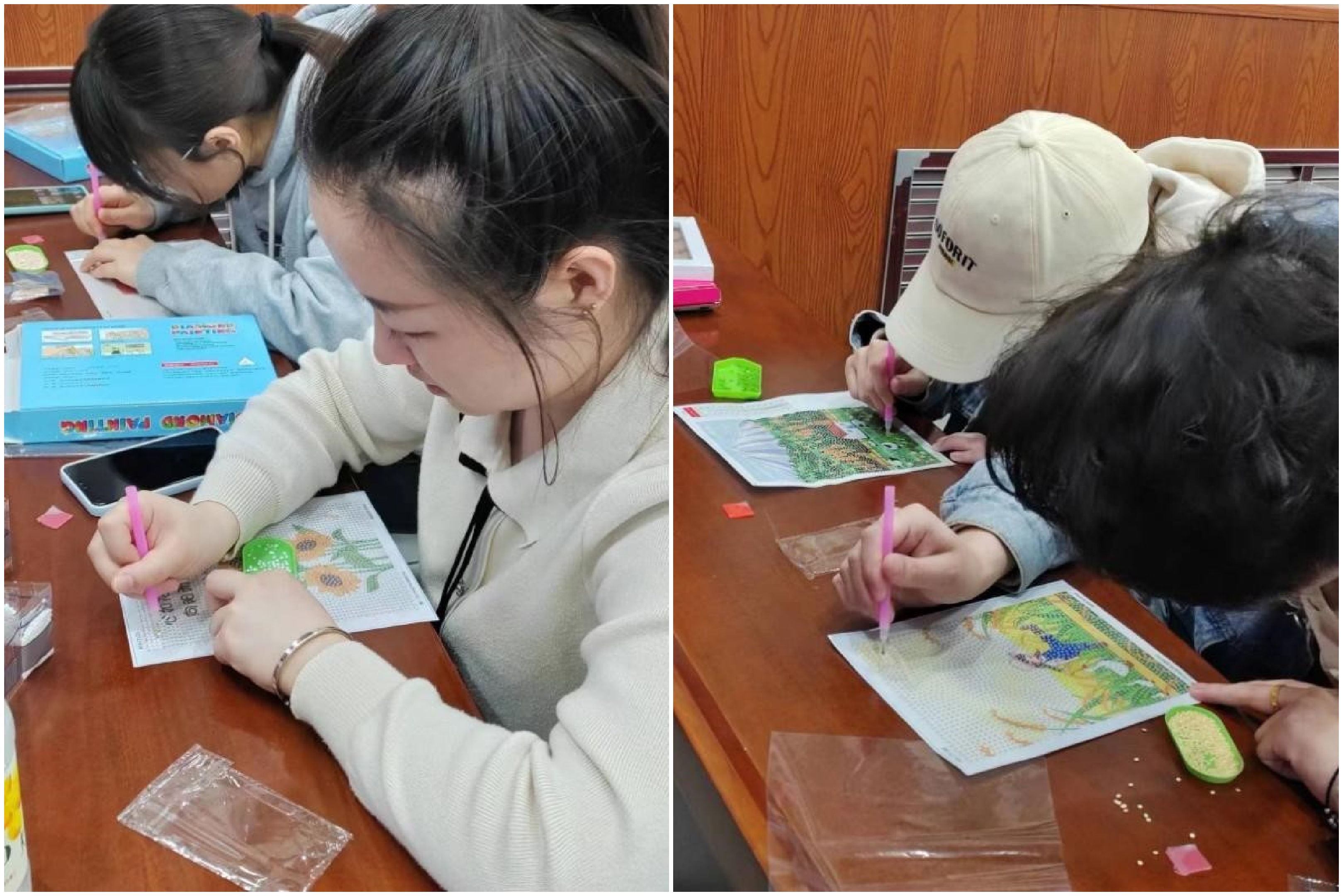 活动伊始,程澄引导同学们选择个人喜欢的钻石画图案。图案内容既有“向日葵、柿柿如意”、“心如花木,向阳而生”等文字图案,也有哆啦A梦、大熊猫等积极阳光的卡通人物或元素,这对同学们的心理健康有积极正向的引导。随后,程澄介绍了钻石画的制作流程,并带领大家动手制作。同学们在制作过程中全神贯注,帮助同学们进入“心流”状态,提高注意力和情感稳定性,释放心理压力。
