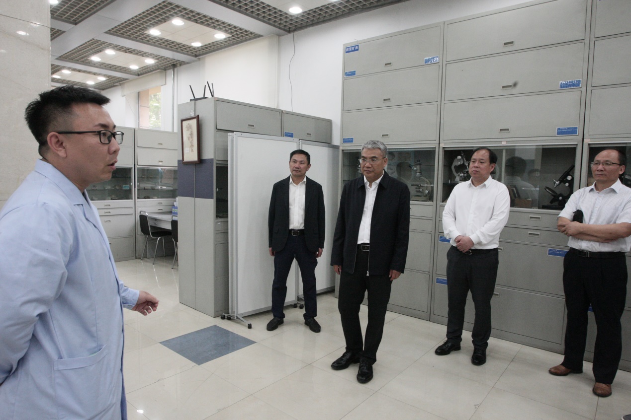 任云生一行随后来到鸽子楼,先后参观了地球物质综合实验室、地球演化综合实验室、三化教室、岩矿鉴定实验室。工作人员对实验室陈列的教学标本、仪器设备、实验室建设历史及取得的成果进行了详细介绍。学院和校办领导对三化教室功能进行了演示,对建设进程进行了介绍。面对熟悉的环境、熟悉的面孔,任云生校长感触颇多,他对教学实验室的变化表示赞许,对日趋完善的学习、工作、科研环境表示肯定。