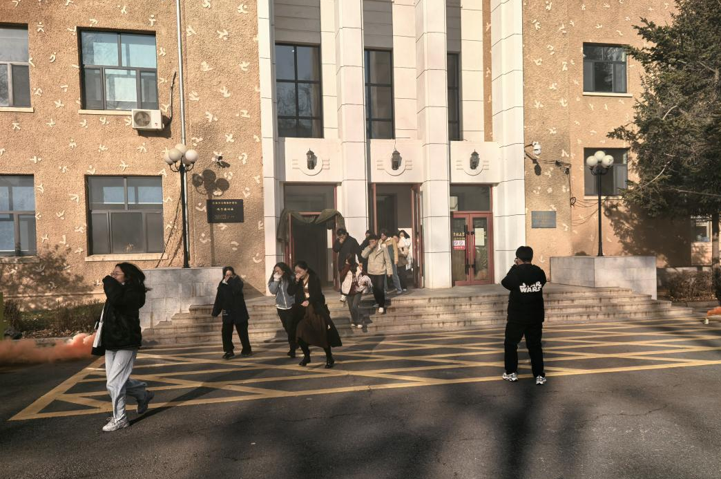 讲座结束后,在场师生在保卫处老师的指令下进行消防演练活动,同学们在楼层疏散引导员的指挥下,低伏姿势捂住口鼻,有序地向鸽子楼外撤离。在室外,老师向同学们讲解了干粉灭火器和二氧化碳灭火器的使用方法,指导同学们正确使用灭火器扑灭明火。