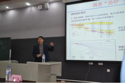 单玄龙院长首先从国家建设发展战略和需求,国际新型地下能源利用现状入手,对新时代的地球科学进行了定位:新时代的地球科学肩负着为国家探寻地下新能源、为国家巨大能源需求填补缺口的重要使命,是在当今“世界未有之大变局”中维持中国国际地位至关重要的一环,是新时代实现中华民族伟大复兴不可或缺的一环。单玄龙院长以未来石油资源的重要接替资源——油砂为例,向同学们介绍了非常规资源在世界能源结构中的重要地位。他表示,我国油砂资源主要分布在新疆、青海、西藏、四川、贵州、广西、浙江、内蒙等地区,资源量丰,开发开采潜力大,对国家发展意义深远。他鼓励同学们应自强不息,自信满满地接过国家未来科学战略规划和经济繁荣发展的接力棒。