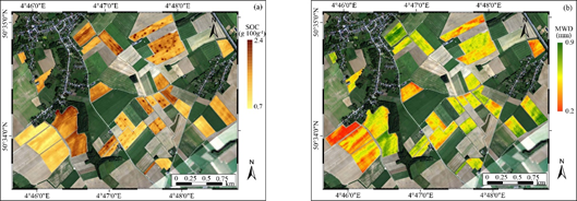 图2 基于APEX航空高光谱影像的(a)土壤有机碳和(b)团聚体稳定性空间表征