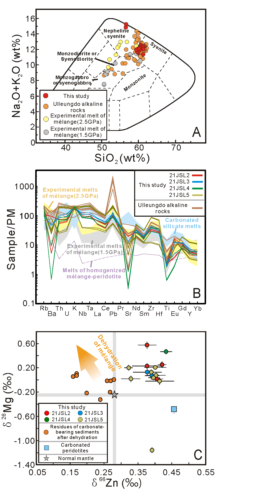 许文良教授引领的“地球深部动力学创新团队”成员王枫教授等通过对中国东北地区渐新世霓霞正长岩的主微量元素以及全岩Sr-Nd-Pb-Mg-Zn同位素的综合研究(图1),证实霓霞正长岩的混杂岩底劈熔融成因,并结合东北亚构造环境演化,揭示了俯冲混杂岩底劈熔融的地幔动力学条件。具体研究成果如下: