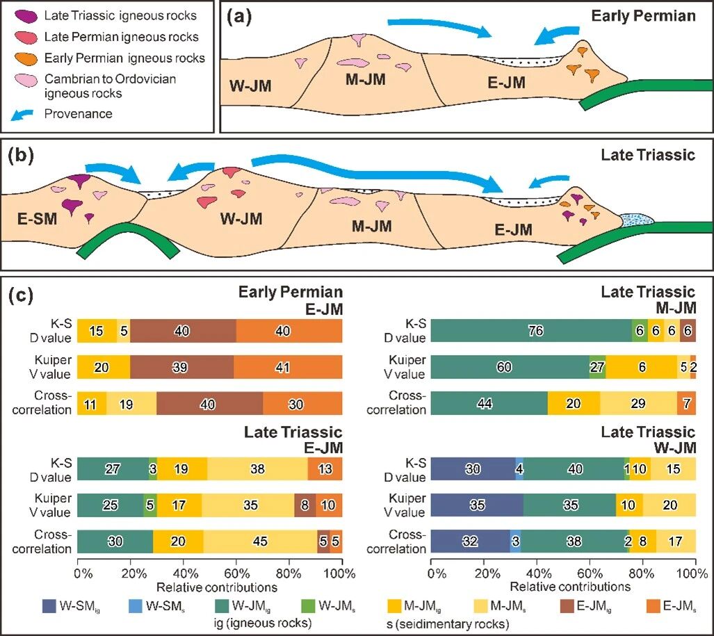 在校正后的碎屑锆石年代学数据基础上,研究进一步引入碎屑锆石物源正演模拟方法,对不同潜在源区在盆地沉积物中的相对贡献比例进行了定量约束(图3),并将该方法与锆石微量元素判别、多维尺度分析等方法相结合,构建了一套多参数约束的盆—山耦合分析框架。研究结果显示,佳木斯地块盆地体系在二叠纪—三叠纪期间经历了显著的物源格局与构造体制转换: