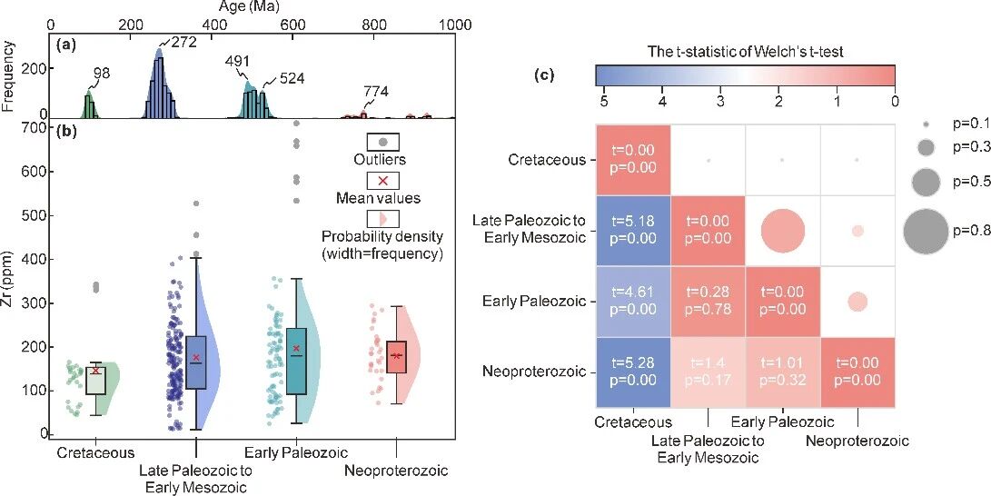 针对这一问题,研究团队系统汇编了佳木斯地块过去三十余年发表的 338 个花岗质岩石样品的年代学与地球化学数据,利用全岩锆(Zr)含量作为锆石丰度的有效代理,对不同年代花岗岩的相对产锆石能力进行了统计分析(图2),并首次在东北地区建立了区域尺度的锆石丰度因子。通过对碎屑锆石年龄分布进行 锆石丰度校正,沉积记录中被“高产锆岩石”放大的信号得以削弱,从而使年龄谱更接近真实的物源贡献比例,提高了物源解释的精度。