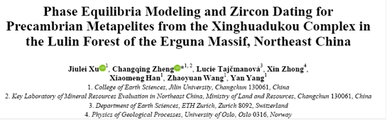 以上研究成果在线发表在地学SCI期刊Journal of Earth Science(Xu, J.L., Zheng, C.Q., Tajčmanová, L., et al., 2018. Phase Equilibria Modeling and Zircon Dating for Precambrian Metapelites from the Xinghuadukou Complex in the Lulin Forest of the Erguna Massif, Northeast China. Journal of Earth Science, 2018, 1-15. DOI:10.1007/s12583-018-0843-z.)。
