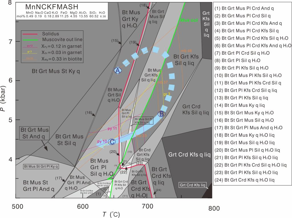 结果表明,绿林林场兴华渡口群变质岩记录了三期变质阶段(图1):进变质阶段(M1),以石榴石核部高Mg#低Ti的黑云母包裹体为特征,温压约为650 °C,6 kbar;近峰期高角闪岩相变质阶段(M2),以石榴石幔部高Mg#高Ti的黑云母包裹体为特征,温压为710-720 °C,5-6 kbar;后期退变质阶段(M3),以后生白云母和残留石榴石变斑晶为特征,温压范围约640°C,4-5 kbar。其过程表明岩石先后经历饱和水固相线熔融、白云母脱水熔融和部分黑云母脱水熔融,之后由于滞留熔体的存在,在退变质阶段中以近等压降温(IBC)的方式依次发生黑云母脱水熔融、白云母脱水熔融和饱和水固相线熔融反应的逆反应,从而形成一个顺时针的P-T轨迹,变质级别达到高角闪岩相,揭示出俯冲碰撞的构造环境,为限定新林喜桂图缝合带的构造属性提供了新的证据。