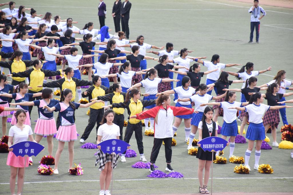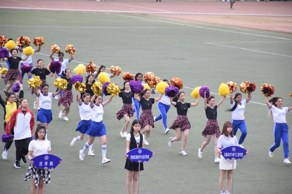第57届运动会正式开幕,从八点半起,伴随着比赛的进行,变成了各学院庞大的广播体操啦啦操表演队伍,地科的队伍与大部队一起, 为场上的运动健儿们加油助威。