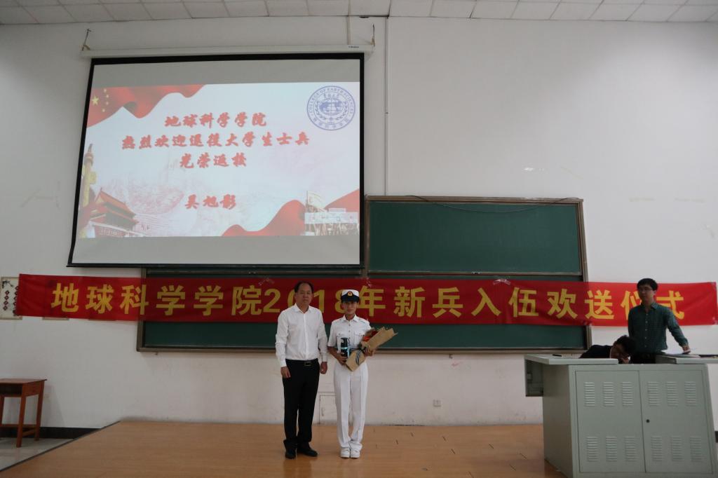 首先,杨洲书记为应征入伍的新生——2017级资源勘查工程的胡嘉诚同学佩戴了“光荣入伍”的大红花及纪念品。希望他在军营中磨砺自己,刻苦训练,为国家、为学校争光。
