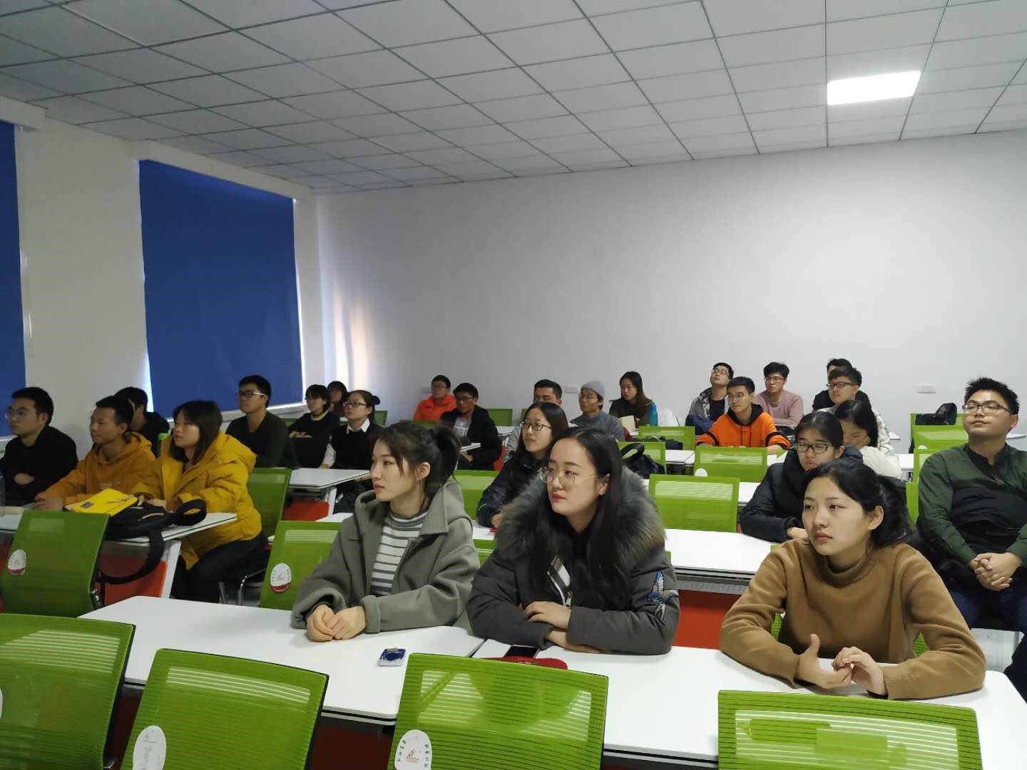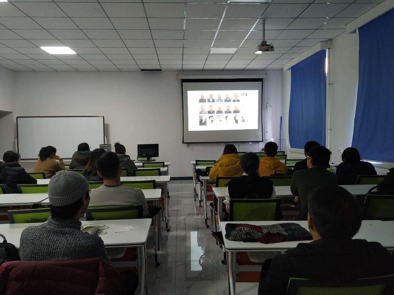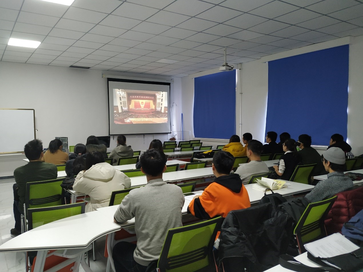 13时30分,活动负责人准时播放《庆祝改革开放40周年大会》视频,同学们一起认真观看视频。