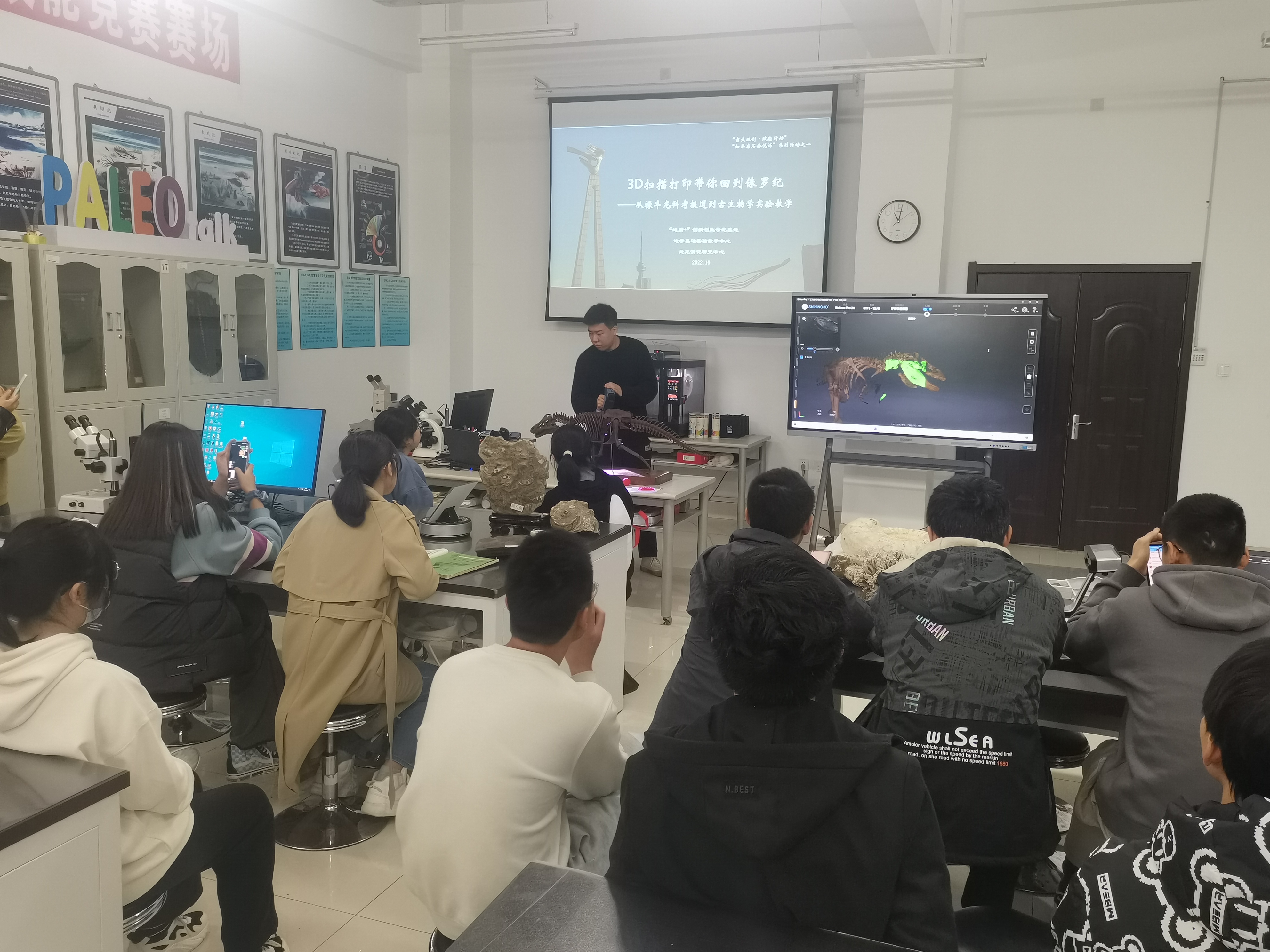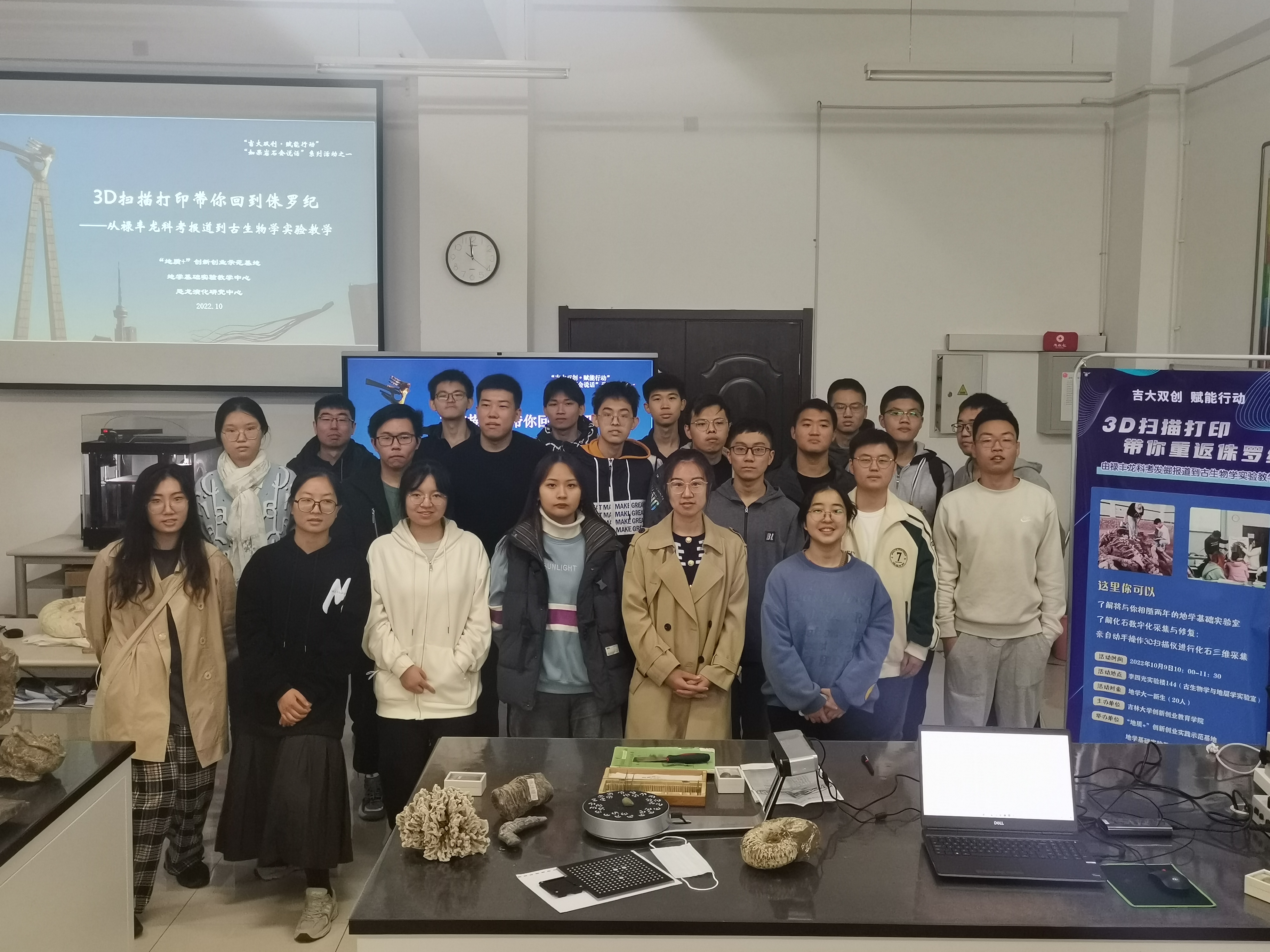 2022年10月9日,“地质+”创新创业实践示范基地在李四光实验楼144古生物与地层学实验室内,组织开展了“3D扫描打印带你重返侏罗纪”实践活动,活动由黄色影片