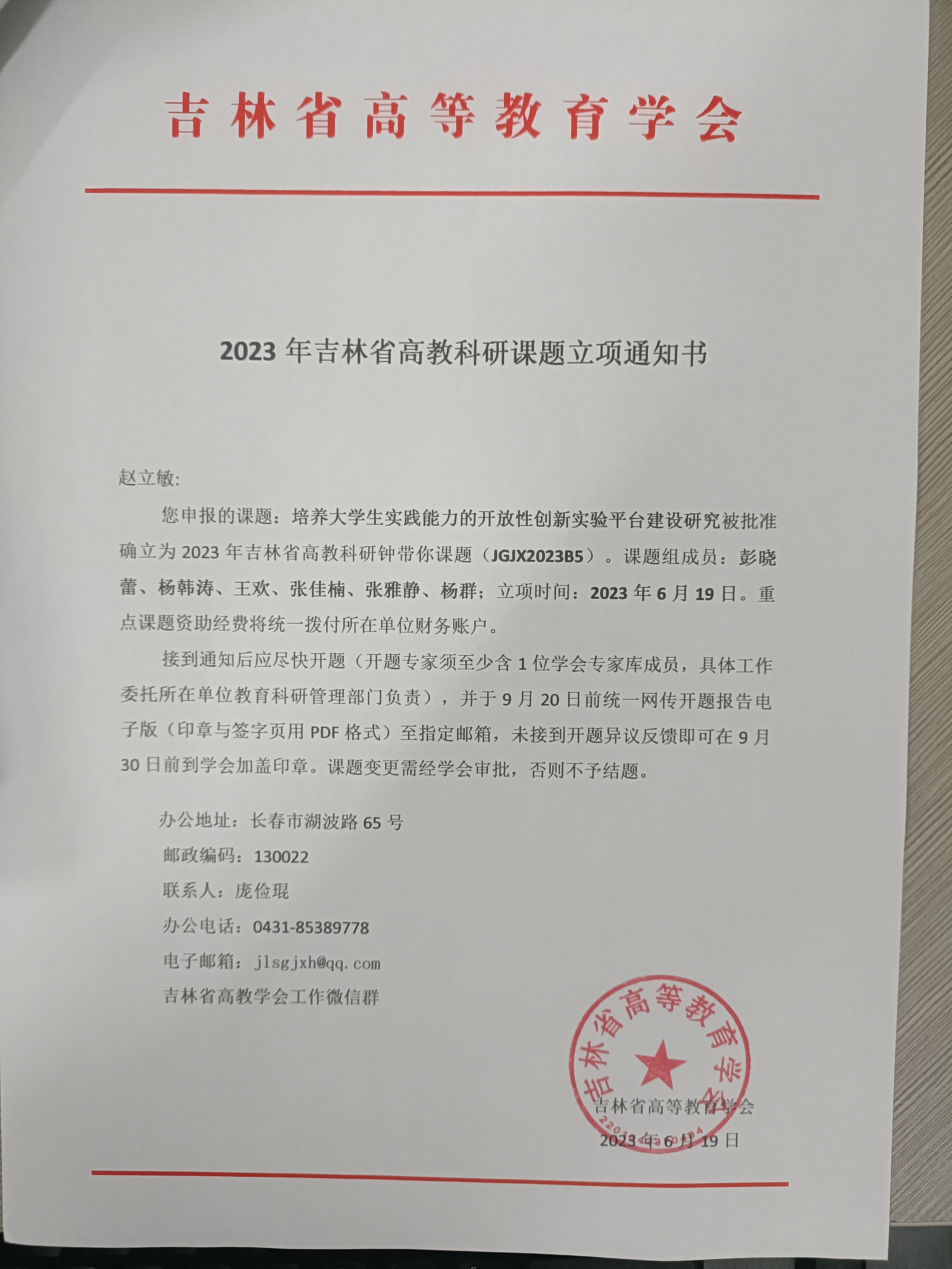 经各高校申报,省高教学会组织专家组初评、复评和终评,中心赵立敏负责的“培养大学生实践能力的开放性创新实验平台建设研究”项目,被确立为2023年黄色影片 高教科研课题重点项目,项目编号JGJX2023B5。2023年黄色影片 高教科研课题重点项目共立项58项,其中重点课题6项、重点自筹课题10项、一般课题42项。相关信息可在吉林省高等教育学会官方网站(//www.jlgjxh.com.cn)查询。