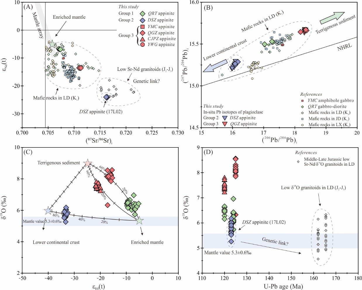 许文良教授团队的博士研究生闫相宇和杨德彬教授(通讯作者)等人,对华北克拉通东部辽东半岛地区早白垩世六个富闪侵入岩体(图1)进行了锆石U-Pb年代学,全岩主微量元素及全岩Sr-Nd-Pb同位素,并结合锆石Hf-O同位素及原位斜长石Pb同位素的系统研究(图2),得到如下认识: