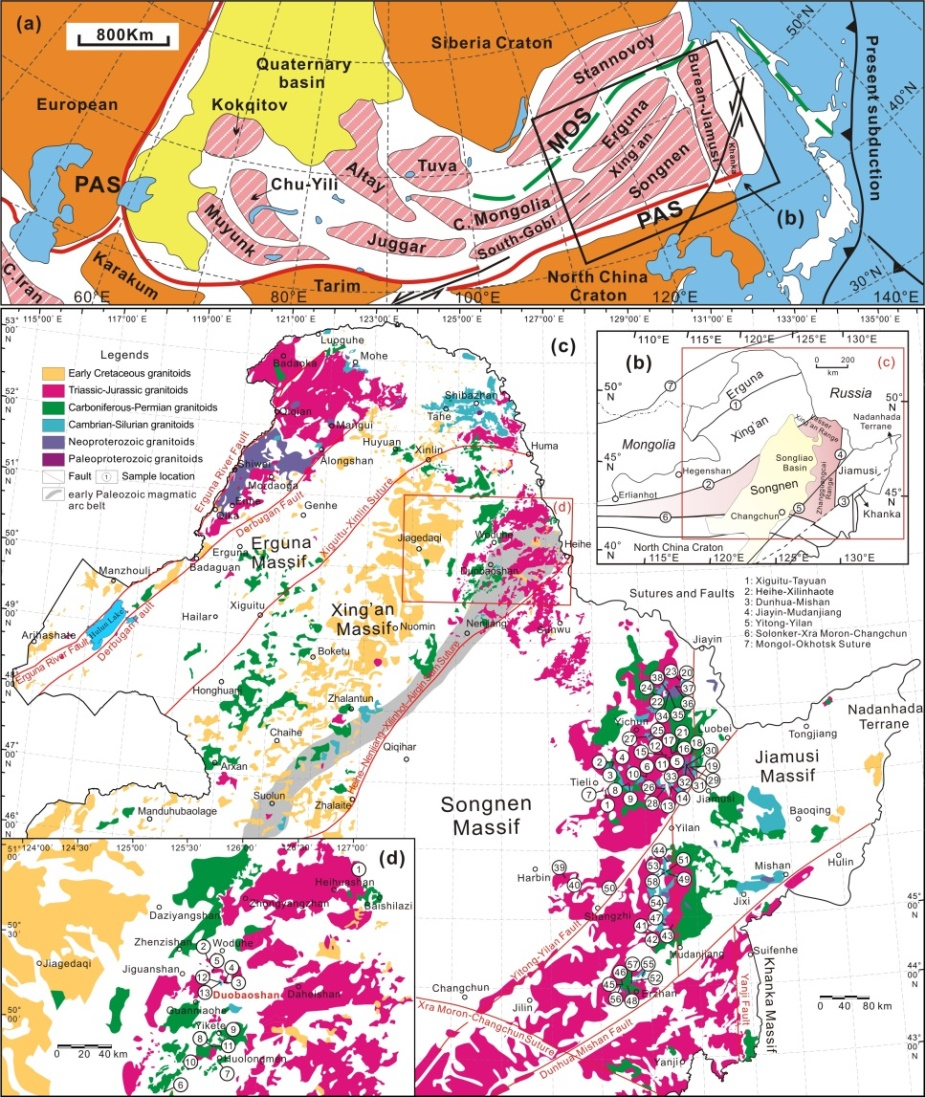 许文良教授团队的博士研究生龙欣雨和唐杰副教授(通讯作者)等人,对中亚造山带东段的松嫩地块和多宝山岛弧地体上广泛分布的花岗质岩石(图1)开展了系统的锆石U-Pb年代学、全岩地球化学和锆石Hf同位素研究,利用花岗岩的结晶年龄和模式年龄,建立了中亚造山带东段的地壳生长模型。取得了以下主要认识: