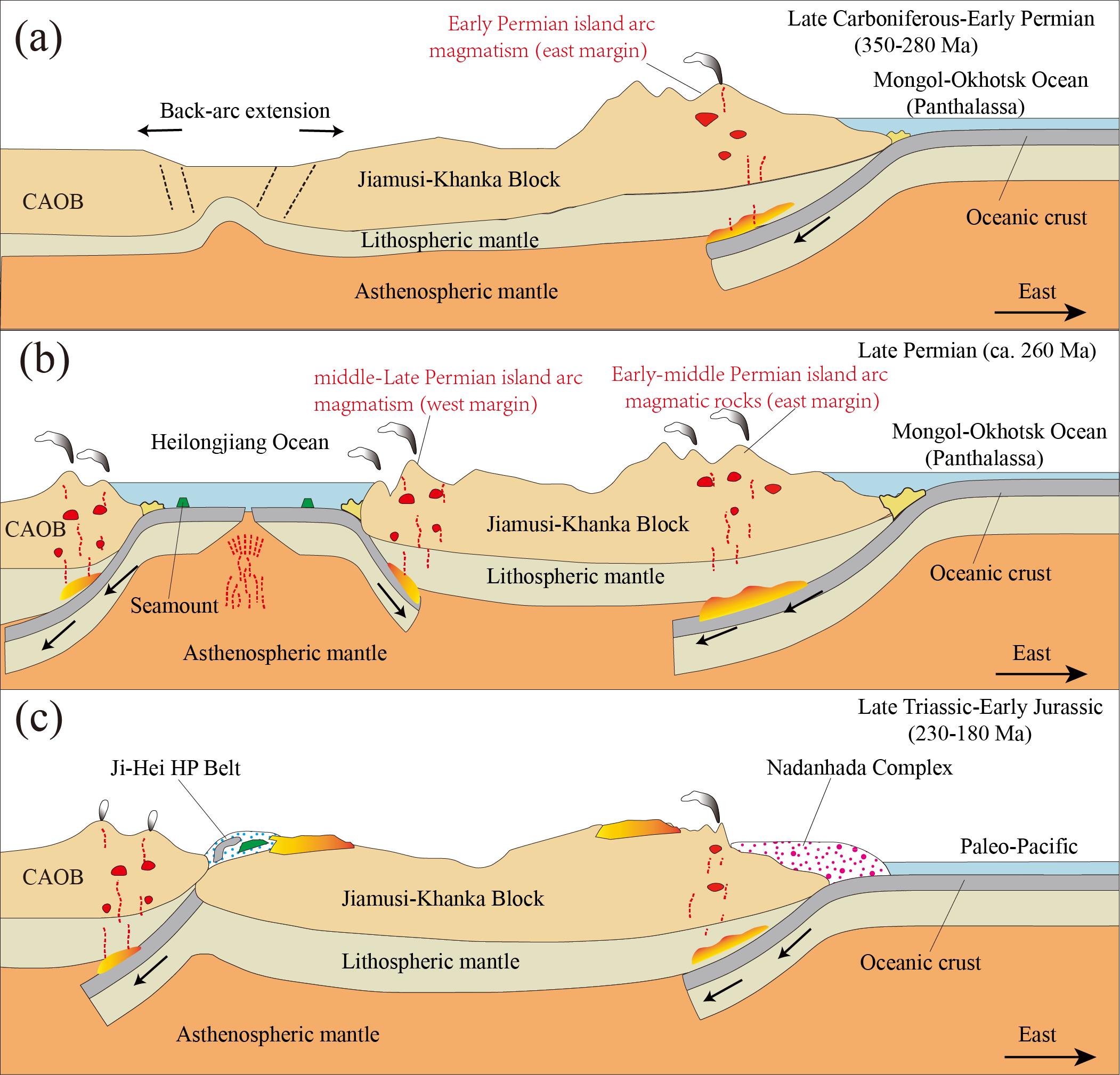 (3)在晚二叠世期间,由于黑龙江洋的俯冲,佳木斯地块发生西缘大量岩浆活动,并最终导致中-晚二叠世岛弧岩浆带形成(图4b和图5c)。