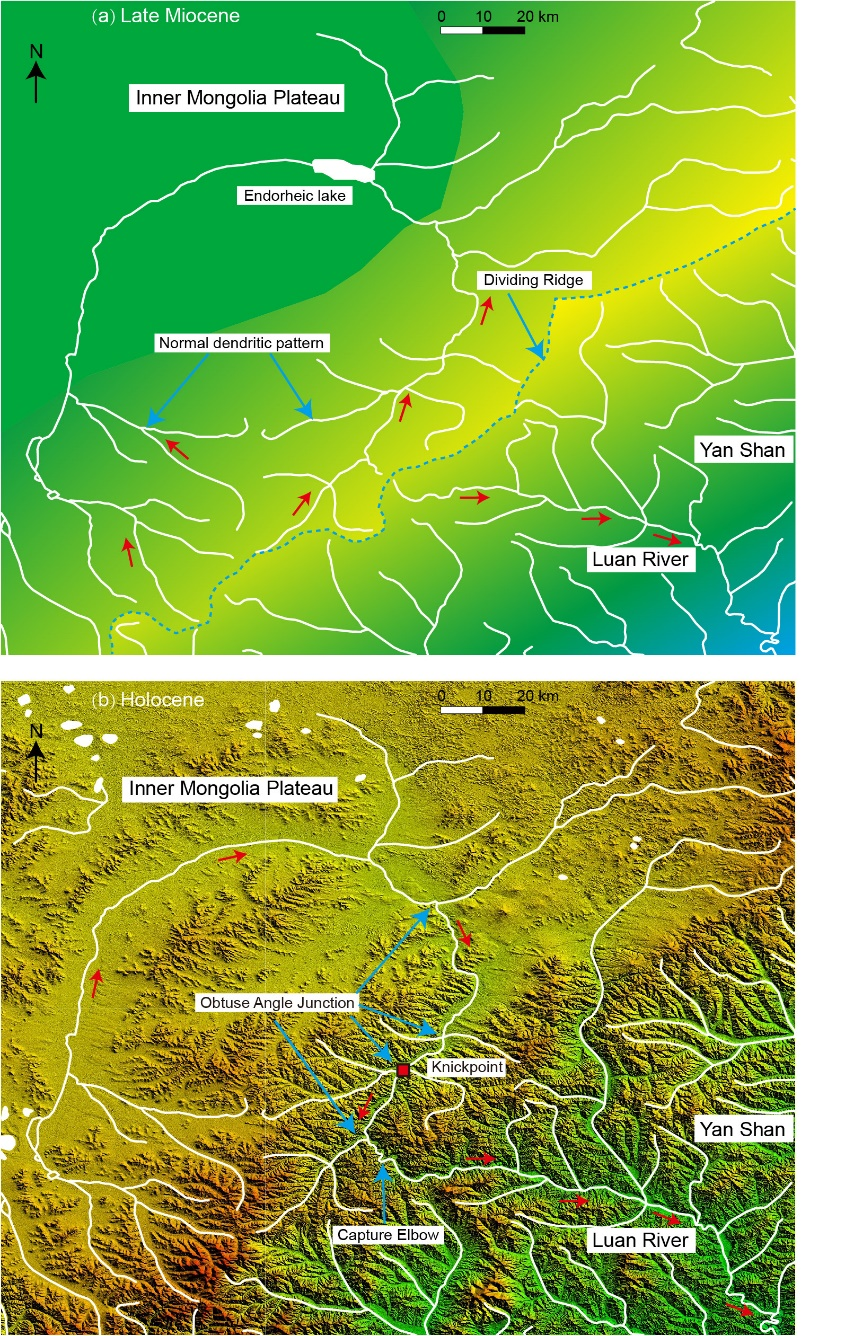 同时,本研究根据滦河上游(闪电河)的水系展布样式,袭夺湾的识别,滦河河流纵剖面的形态和裂点分析,Chi(χ)指数所反映的分水岭迁移方向,新近系沉积记录等,提出滦河上游(闪电河) 是古滦河上新世期间溯源侵蚀袭夺所形成。