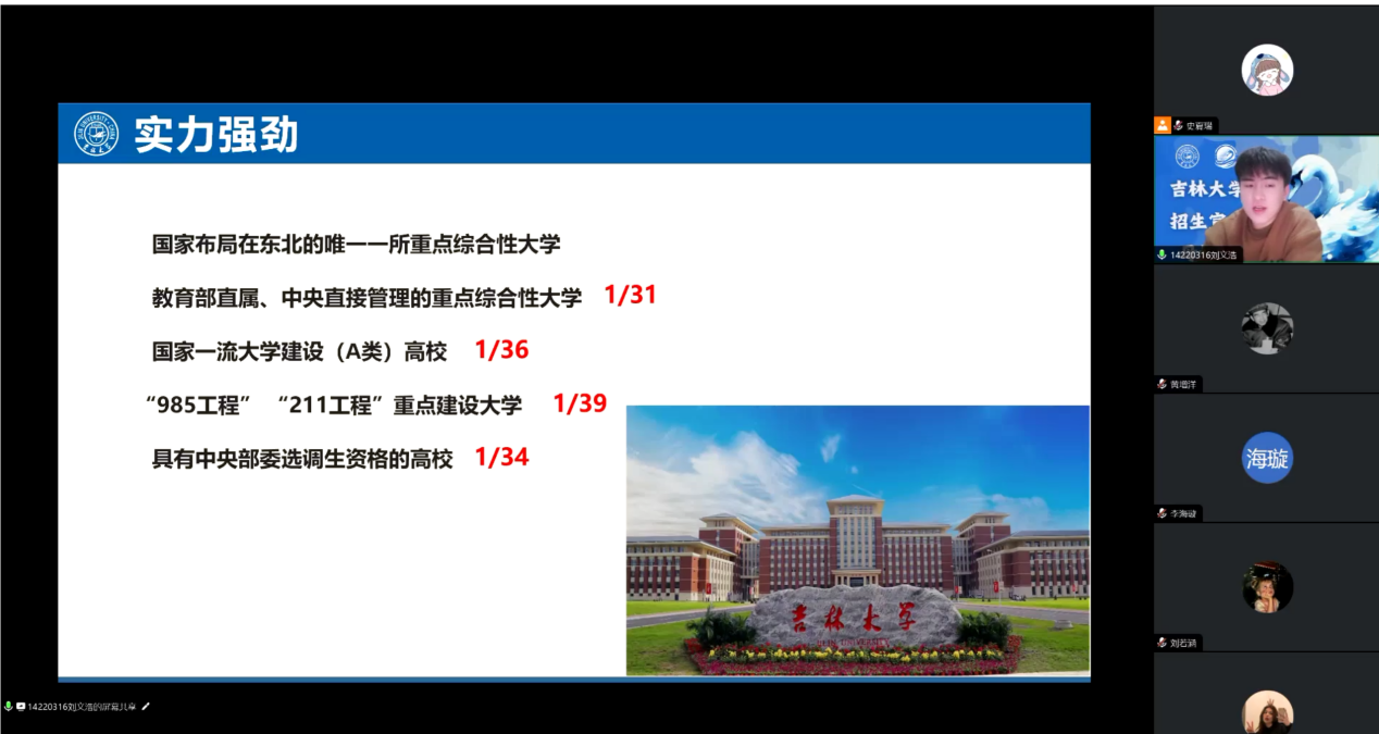 的招生宣传影响力,史夏瑞和刘文浩等同学组成志愿者团队利用母校“暖冬宣讲”高校推介会的契机,在吉大招协的号召与热情帮助下,于乐陵市第一中学开展了一场生动的空中招生宣讲活动,并就吉大在山东省的招生情况与学生进行了分享与交流。