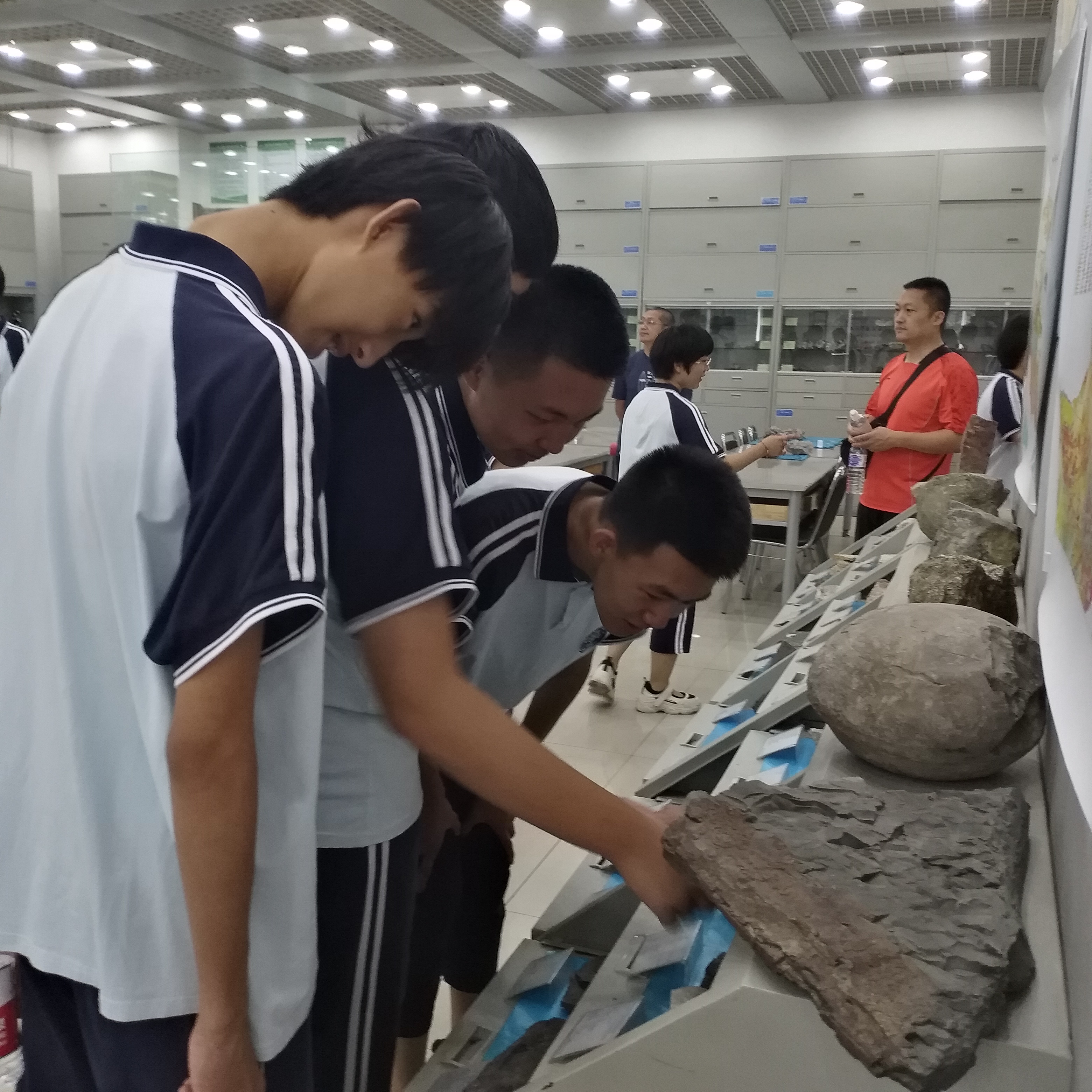 地球演化综合实验室,一块块化石串起了我国古生物多样性,球幕投影追溯了从海洋到陆地的古生物演变进程,化石清修及3D打印勾勒出古生物工作及化石数字化保护的轮廓,同学们对地质年代、地壳运动与生物演化有了感性认识。最后,实验室老师组织了“恐龙蛋盲盒”的互动小游戏,同学们通过恐龙蛋、火山弹、球形风化、灰岩结核等球状岩石构造标本的讲解与亲自动手观察对比,了解恐龙蛋的分类与简单鉴定方法、恐龙灭绝的原因,激发了同学们探索神奇大自然的热情。