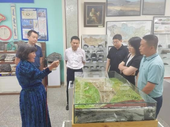 院长单玄龙和蒙古科技大学地质与采矿工程学院院长哈瓦尔·博洛特在蒙古科技大学地质博物馆共同为中蒙国际地学野外实践教学基地揭牌。代表团参观了蒙古科技大学地质博物馆。